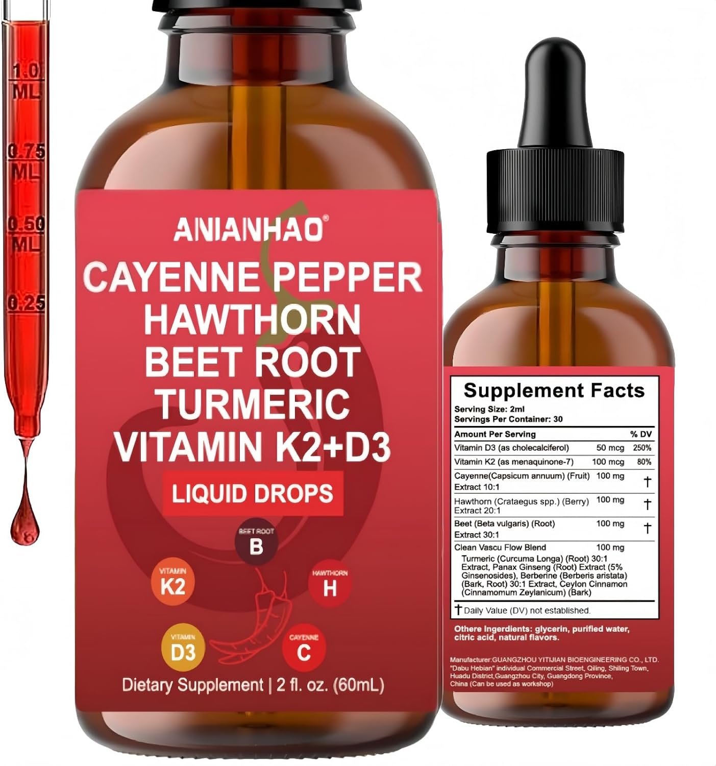 • Premium Cayenne Pepper Drops – Pure & potent formula with Hawthorn, Beet Root, Turmeric, and Vitamins K2+D3 to naturally support blood circulation and cardiovascular health