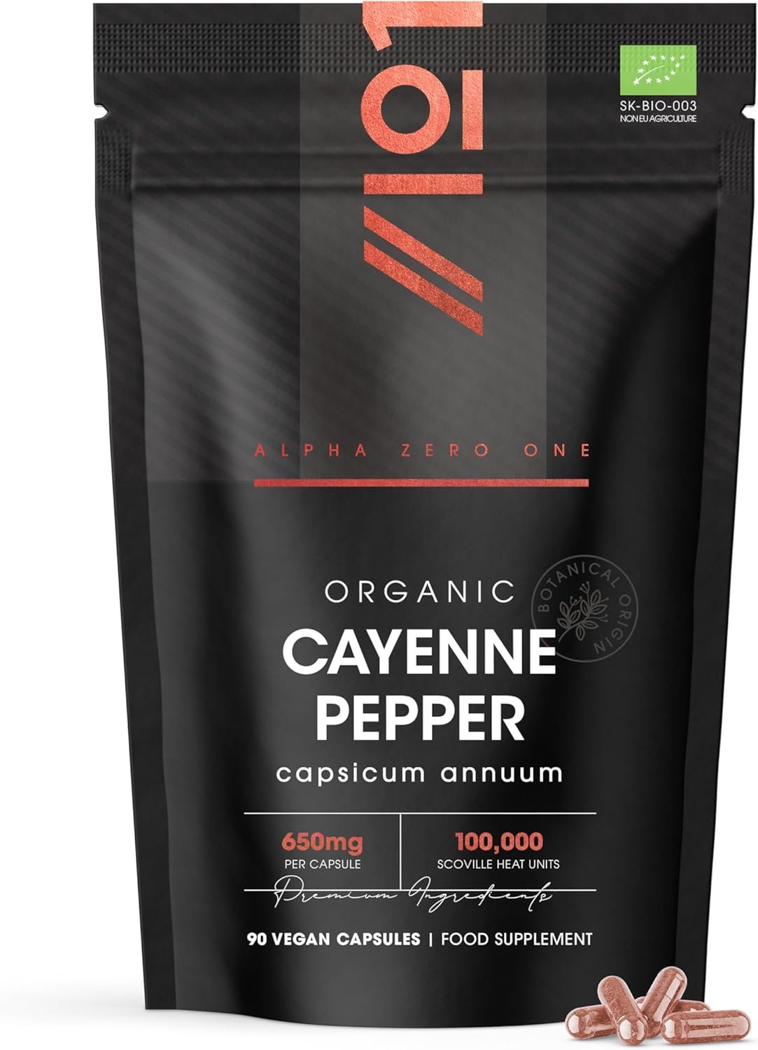 Organic Cayenne Pepper Capsules 650mg (per Capsule) – 100,000 Scoville Heat Units (SHU) – 90 Count - Capsicum Annuum – by Alpha01