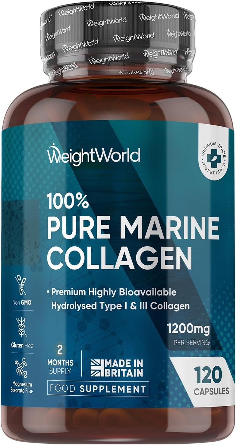 - TYPE 1 & 3 HYDROLYSED COLLAGEN PEPTIDES: Weightworld Marine Collagen capsules are made from 100% pure ingredients and are free from harmful additives. Each capsule contains highly bioavailable Titagen Type-1 and Type-3 collagen. Each bottle provides 120 capsules, delivering 1200mg of hydrolysed fish collagen peptide powder for a two-month supply.