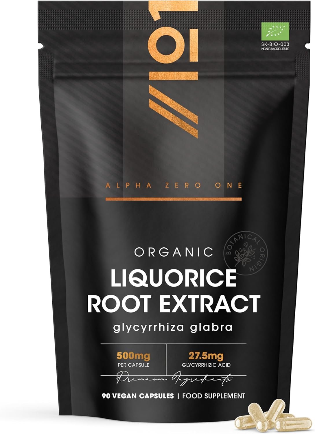 - ✔ HIGH-STRENGTH EXTRACT – Each capsule contains 500mg of organic Liquorice Root Extract, delivering 27.5mg of naturally occurring glycyrrhizic acid. Sourced with care to ensure purity and consistency in every dose.
