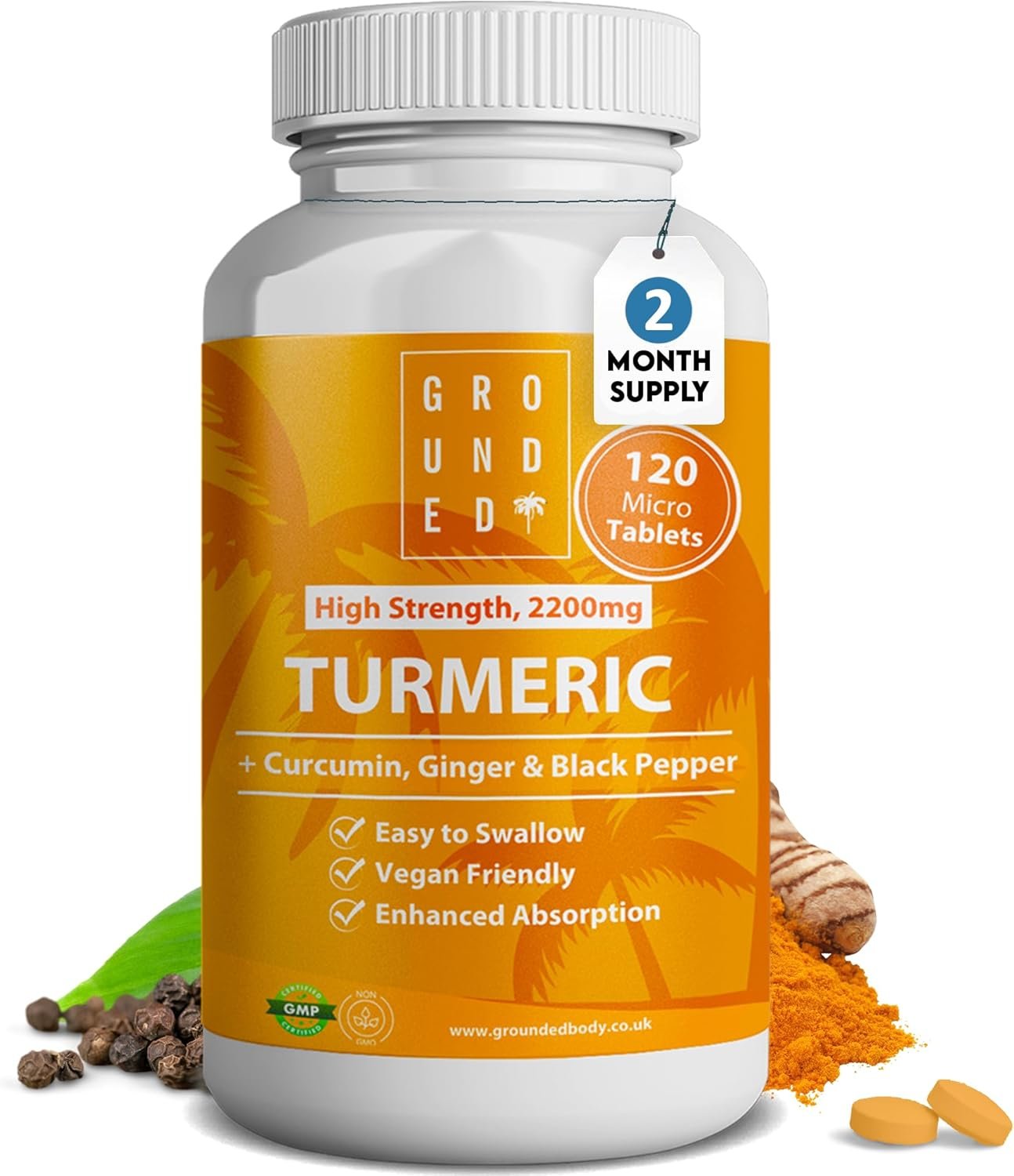 Grounded Turmeric Tablets 2,200mg with Black Pepper & Ginger 35:1 Extract | 2 Month Supply, 120 Tablets | High Strength Herbal Curcumin Supplement |...